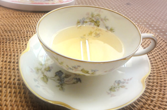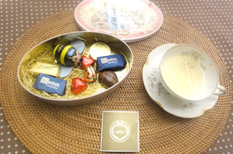 古いリモージュのティーカップに薄めの山茶をいれ、チョコレートとの楽しみ。 |