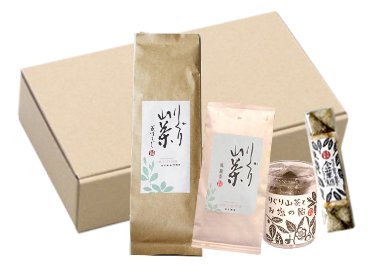 りぐり山茶のほうじ茶と釜炒り山茶、お塩の飴と金華糖のセットです。